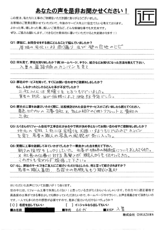 お客様の声 – 雨漏り修理・外壁修理の狭山市在住のお客様